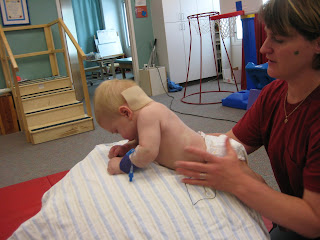 The swallow study has been postponed until further notice due to his feeding issues. The speech therapist explained that if your gut doesn’t feel good the natural response is to not allow anything in your mouth. She said it is very important to make everything that surrounds eating a very positive experience and that we should not force anything. When he is opening his mouth by himself and seems to be comfortable with having food in his belly we will try again. Note to self: No more prying his mouth open to shove a sugar covered binky in his mouth. The doctor has changed his formula to one that is partially digested so he has less gas and hopefully will feel better. I think he is a little bit happier with this new food but not completely. If this doesn’t work the next step is to add another medication to help his system empty quicker. Other possible reasons to his irritation are gastric reflux, having his arm and leg braces on, just becoming more alert and not knowing how to express himself.
