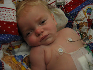 Charlie started to stir around 12:15. This happened to be perfect timing as it was time to take his vitals and give him some more medication. Luckily, his blood pressure got just barely high enough to allow him to recieve his Clonidine. Jenny(Charlie's nurse) let me give him his meds for more practice. I figure that if (as his treat aunt) I can't give him oreos, Clonidine is the next best thing. It's pretty much candy to him anyway, right? We decided that since he was awake and it would take about 25-30 minutes for his medication to kick in(since it is given through his feeding tube not his PICC line) it was a perfect opportunity to give him a bath. He had a good long soak in the tub and would periodically relax in between his grimaces and cries. At one point he even started to dose off. After his bath, we wrapped him in towels and I got to hold and rock this precious angel while nurse Jenny changed his bedding. After the bedding was changed, I diapered him and lotioned him while Jenny and another nurse cleaned and re-bandaged his PICC line dressing(which ticked him off and kept his little legs a kickin)! I then learned how to clean and bandage his G-tube dressing and how to hook it back up to the pump. Jenny brushed his two little teeth, suctioned his nose, and vaselined his lips. Whew! What a process. After putting his baby leg socks back on, we positioned on his opposite side and cushioned him like a baby burrito. At this point, you could tell his meds were kicking in and he mellowed right out after tucking a blanket around him. Right now, he is sleeping once again and smells so clean and fresh! What a sweetie. I love this little man so much!